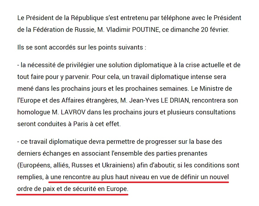 "Эта дипломатическая работа должна позволить продвинуться вперед на основе последних обменов мнениями с привлечением всех заинтересованных сторон (европейцев, союзников, россиян и украинцев), чтобы добиться, если будут выполнены условия, встречи на высшем уровне с целью определить новый порядок мира и безопасности в Европе", - говорится в сообщении.