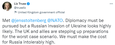 "Необходимо продолжать дипломатию, но вторжение России в Украину выглядит весьма вероятным. Великобритания и союзники усиливают подготовку к наихудшему сценарию. Мы должны сделать цену для России невыносимо высокой", - написала Трасс.