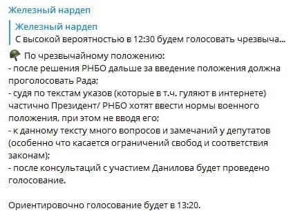 Напомним, секретарь СНБО Алексей Данилов после брифинга ведомства заявил, что на всей территории Украины будет введено чрезвычайное положение. Оно будет действовать 30 дней, в случае необходимости президент может продлить его ещё на такой же срок.