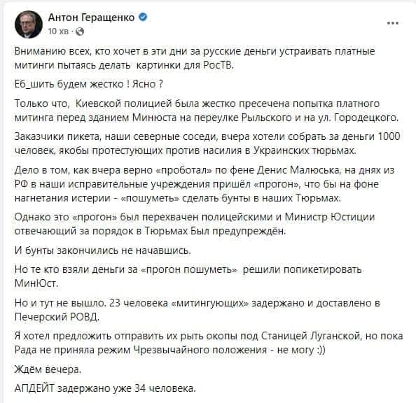 "Заказчики пикета, наши северные соседи, вчера хотели собрать за деньги 1000 человек, якобы протестующих против насилия в Украинских тюрьмах. Дело в том, как вчера верно "проботал" по фене Денис Малюська, на днях из РФ, в наши исправительные учреждения пришел "прогон", чтобы на фоне нагнетания истерии - "пошуметь", сделать бунты в наших Тюрьмах", - заявил Геращенко и добавил, что эту информацию перехватила полиция.