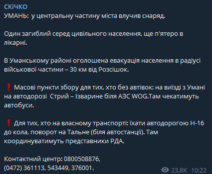 Также в центральную часть города Умань попал снаряд, сообщает глава Черкасской ОГА Александр Скичко.