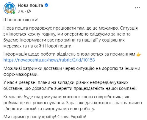 "В связи с введением военного положения, ради сохранения вашей безопасности и безопасности наших работников отделения Укрпочты не будут работать 24 февраля. Как только ситуация позволит, мы сразу доставим посылки и пенсии, а пока будем их хранить.