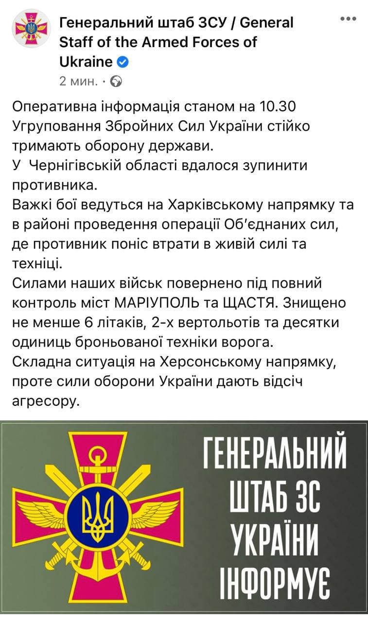 Вооруженные силы Украины сообщают, что по состоянию на 10:30 в Черниговской области противник остановлен. Под Харьковом идут бои, около Крыма и на Донбассе тяжёлая ситуация.