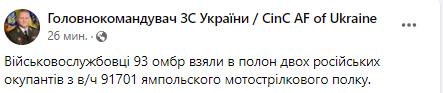 Главнокомандующий Вооруженными силами Украины Валерий Залужный в Фейсбуке сообщил о первых пленных.