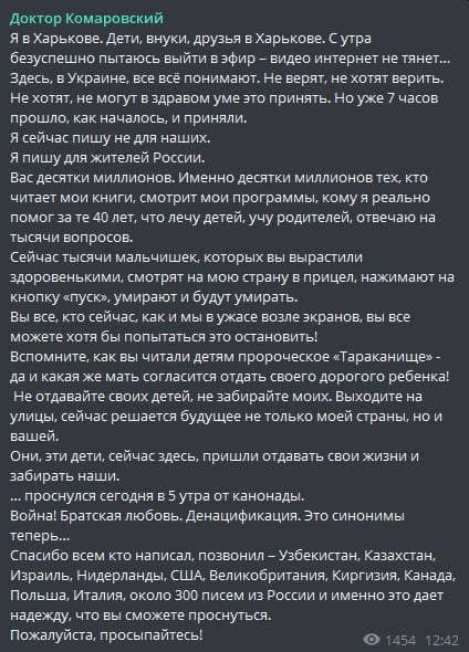 Я сейчас пишу не для наших. Я пишу для жителей России. Вас десятки миллионов. Именно десятки миллионов тех, кто читает мои книги, смотрит мои программы, кому я реально помог за те 40 лет, что лечу детей, учу родителей, отвечаю на тысячи вопросов. Сейчас тысячи мальчишек, которых вы вырастили здоровенькими, смотрят на мою страну в прицел, нажимают на кнопку "пуск", умирают и будут умирать.