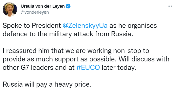 "Поговорила с президентом Зеленским, поскольку он организует оборону от военной атаки со стороны России. Я подтвердила ему, что мы неустанно работаем, чтобы обеспечить максимальную поддержку Украине. Обсудим ее также на саммите ЕС и G7", - написала глава ЕК в Twitter.