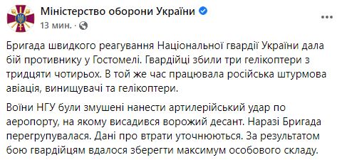 По данным ведомства бригада быстрого реагирования Нацгвардии дала бой. Сбиты три вертолета из тридцати четырех. В то же время работала российская штурмовая авиация, истребители и вертолеты.