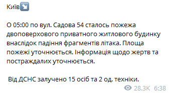 "В 05:00 на ул. Садовая, 54 произошел пожар двухэтажного частного жилого дома в результате падения фрагментов самолета. Площадь пожара уточняется. Информация о жертвах и пострадавших уточняется", - сообщили спасатели.