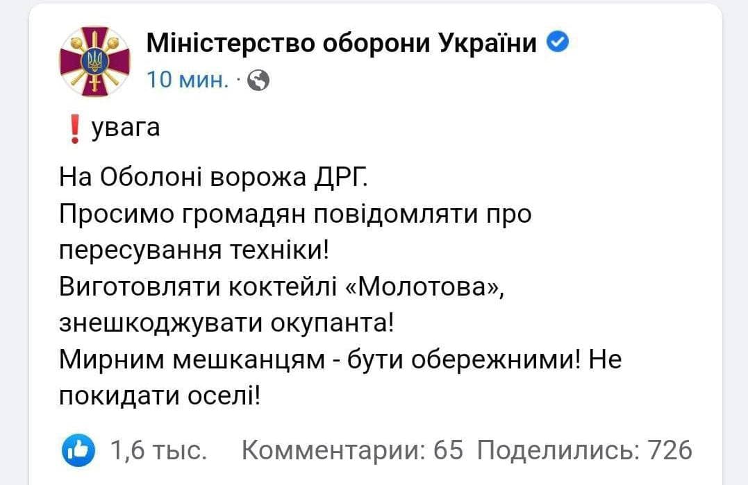 10:02 Киев. По Оболонскому проспекту движется военная техника. Минобороны заявляет о проникновении российской ДРГ.