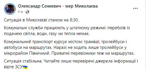 09:51 Мэр Николаева пишет, что утром ситуация в городе стабильная: транспорт ходит, свет, вода, газ - есть.