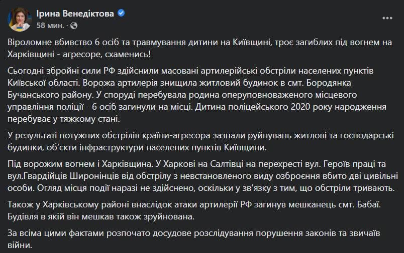 14:04 Кличко о ситуации в городе. "Киев продолжает держать оборону, российских войск в столице нет. Но наши военные, правоохранители, тероборона продолжают выявлять и обезвреживать диверсантов. Ночью были столкновения и перестрелки. Уничтожили несколько ДРГ. Именно ради вашей безопасности мы ввели комендантский час до завтрашнего утра. Не выходите, пожалуйста, на улицы. Выйти можно только если по сигналу воздушной тревоги вы идёте в укрытие. Россия обстреливает жилые кварталы столицы Украины. Россия убивает украинцев по всей Украине. В Киеве с начала атаки 24 февраля погибли 9 мирных жителей. В том числе один ребенок, 4 неизвестных лица и 18 военных теробороны. Ранены 106 людей. Из них - 47 гражданских, в частности, трое детей..."