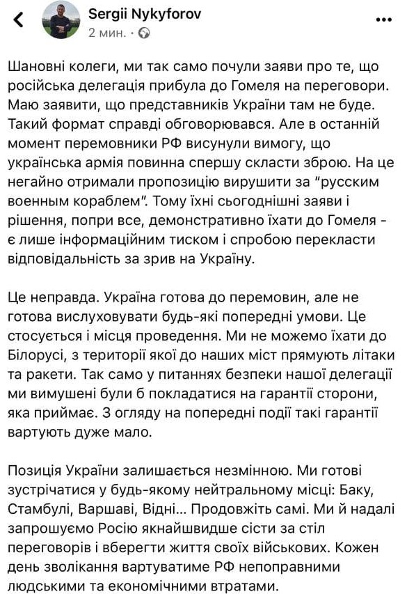 14:30 Делегация Украины едет на переговоры с российской стороной в белорусский Гомель, сообщили в Национальном пресс-центре Белоруссии со ссылкой на общественного деятеля Юрия Воскресенского.