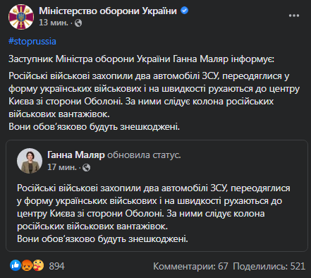 "Российские военные захватили два автомобиля ВСУ, переоделись в форму украинских военных и на скорости двигаются в центр Киева со стороны Оболони. За ними следует колонна российских военных грузовиков. Они обязательно будут обезврежены", написала Маляр.
