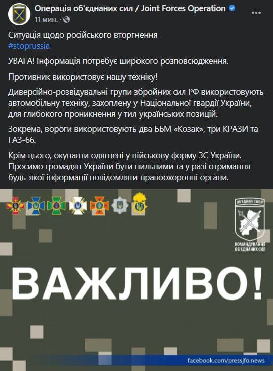 О том, что российские военные могут перемещаться на захваченной технике в форме ВСУ, также предупреждает Штаб ООС.
