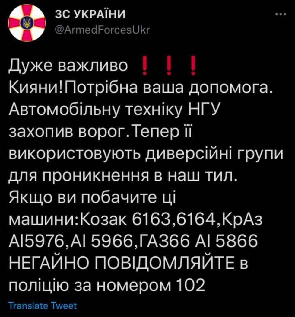 "Киевляне, нужна ваша помощь. Автомобильную технику НГУ захватил враг. Теперь ее используют для проникновения в наш тыл. Если вы увидите машины Козак 6163, 6164, КРАЗ, АИ 5976, АИ 5966, ГАЗ 366, АИ 5866 немедленно сообщите в полицию за номером 102", - заявили в ВСУ.