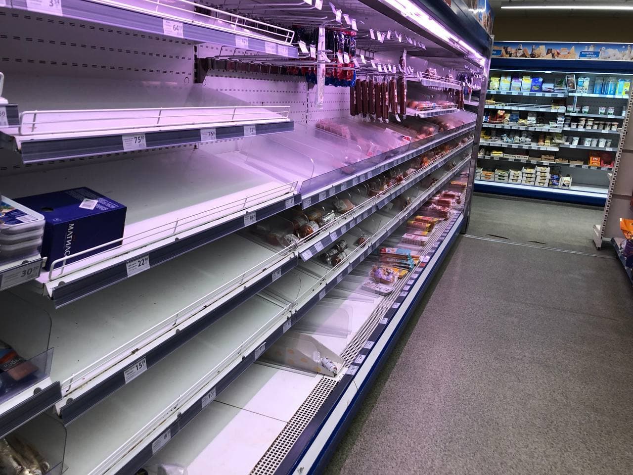 Появились фото продуктовых магазинов Киева, в которых размели хлеб и воду
