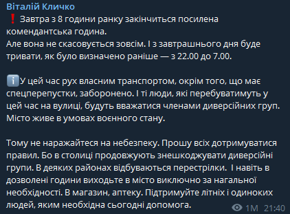 Поэтому не подвергайтесь опасности. Прошу всех соблюдать правила. Потому что в столице продолжают обезвреживать диверсионные группы. В некоторых районах проходят перестрелки. И даже в разрешенные часы выходите в город исключительно при необходимости. В магазин, аптеку. Поддерживайте пожилых и одиноких людей, которым необходима сегодня помощь", - призвал Кличко.