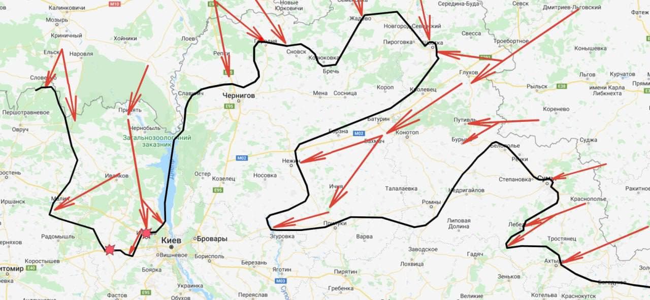 09:37 Такую карту ситуации вокруг Киева публикуют российские телеграм-каналы. Отчасти она совпадает с информацией, которая идёт от украинских источников (хотя и не полностью). Но в целом из неё становится понятен план россиян - взять Киев в кольцо. Сейчас они, судя по всему, попытаются заблокировать столицу с левого берега.
