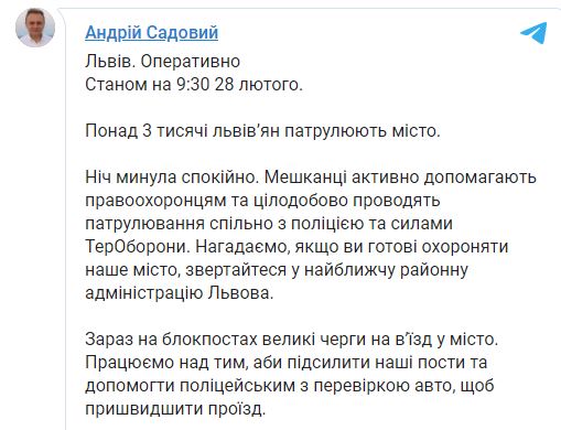 10:11 Львов. Мэр города Садовой отчитался, что ночь прошла спокойно. На блокпостах на въезд в город - очереди.