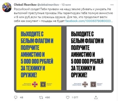 20:53 Министр обороны Резников опубликовал воззвание к российским солдатам. За сдачу в плен предлагает 5 миллионов рублей.