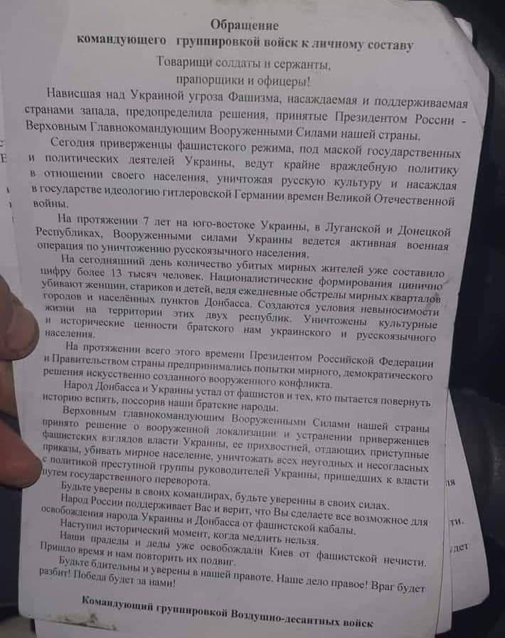 22:09 В сети распространяется, как утверждается, текст обращения командующего группировкой воздушно-десантных войск России к солдатам и офицерам с объяснением зачем нужна война с Украиной.