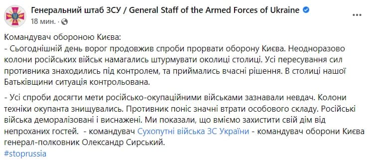 06:45  Генштаб ВСУ заявил, что сегодня уже продолжались попытки противника войти в Киев, но они были отбиты.