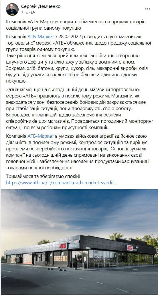 Компания АТБ-Маркет в условиях военной агрессии осуществляет свою деятельность в усиленном режиме, контролирует ситуацию и решает проблемы бесперебойной поставки товаров.