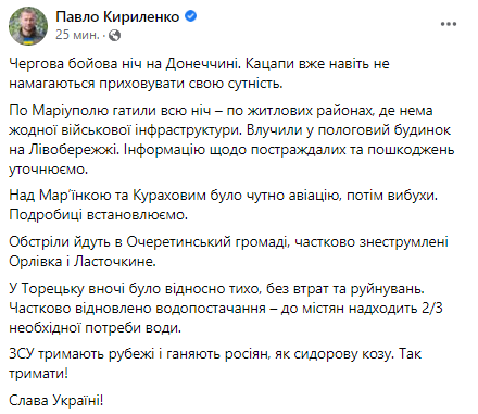 "..По Мариуполю били всю ночь - по жилым районам, где нет ни одной военной инфраструктуры. Попали в роддом на Левобережье. Информацию о пострадавших и повреждениях уточняем. Над Марьинкой и Кураховым была слышна авиация, затем взрывы. Подробности устанавливаем", - написал он.