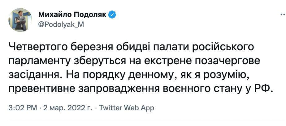 "4 марта обе палаты российского парламента соберутся на экстренное внеочередное заседание. На повестке, как я понимаю, превентивное введение военного положения в РФ", - сообщает Подоляк.