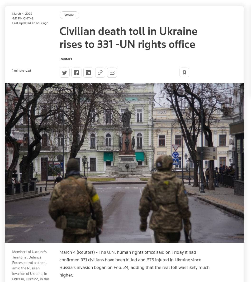20:55 По данным Пентагона, колонна российских войск протяженностью в несколько десятков километров все еще стоит примерно в 25 км к северу от Киева. Ее движение было замедлено украинскими атаками и взрывом одного из мостов.