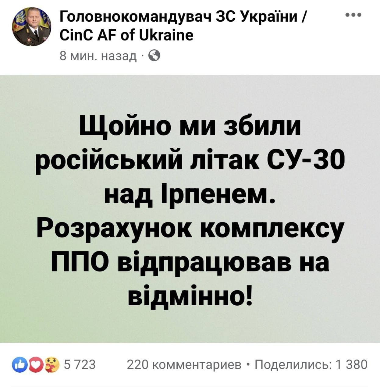 10:18 Главком ВСУ Залужный заявил о сбитом самолёте под Ирпенем.