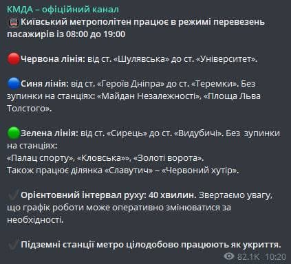 Ориентировочный интервал движения: 40 минут. График работы может оперативно изменяться при необходимости. Подземные станции метро круглосуточно работают как укрытие.