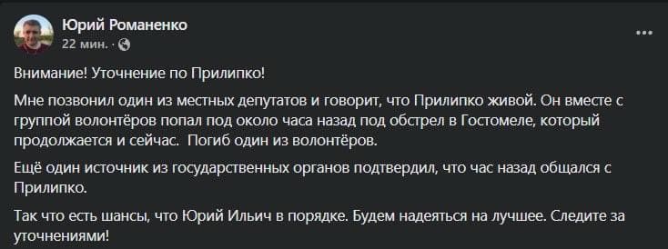 22:40 Журналист Андрей Цаплиенко сообщает, что в Гостомель вновь зашел противник - российские десантники из 31-й десантно-штурмовой бригады (Ульяновск).
