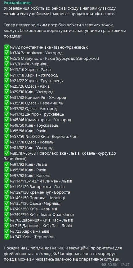 Посадка на эти поезда, как и другие эвакуационные, приоритетна для детей, женщин и пожилых людей. Время отправления и маршрут поездов может варьироваться в зависимости от оперативной ситуации.