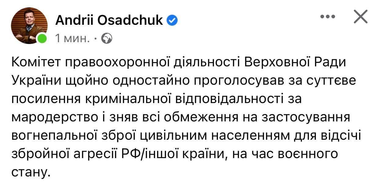 "Комитет правоохранительной деятельности Верховной Рады Украины только что единогласно проголосовал за существенное усиление уголовной ответственности за мародерство и снял все ограничения на применение огнестрельного оружия гражданским населением для отражения вооруженной агрессии РФ/другой страны на время военного положения", - говорится в сообщении.