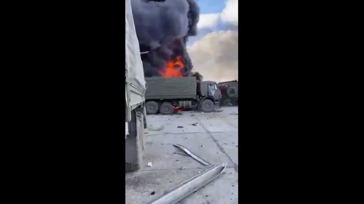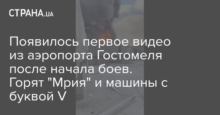 На ролике видно горящие машины с буквой V, а также догорающий самолет "Мрия".
