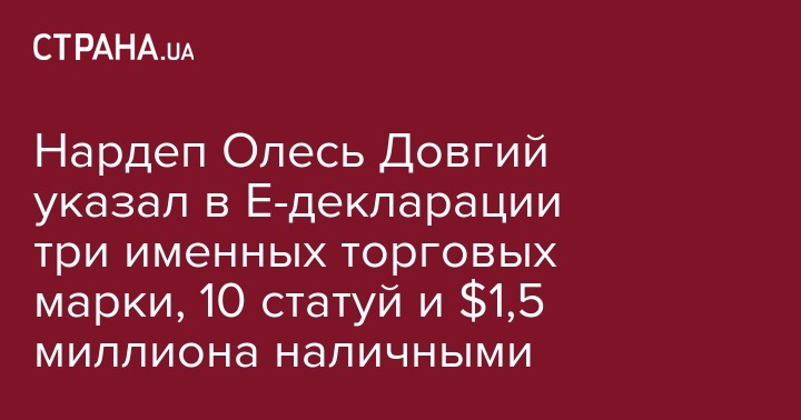 Народный депутат Верховной Рады Олесь Довгий (депутатская группа "Воля народа") задекларировал в своей электронной декларации 95 картин XIX-XXI вв, 10 статуй, 11 наручных часов и 1,5 млн долларов наличными в 2015 году. Об этом сообщают "Украинские новости".