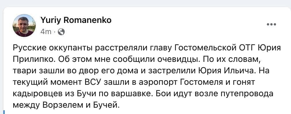 "По их словам, твари зашли во двор его дома и застрелили Юрия Ильича. На текущий момент ВСУ зашли в аэропорт Гостомеля и гонят кадыровцев из Бучи по варшавке. Бои идут возле путепровода между Ворзелем и Бучей", - говорится в сообщении.