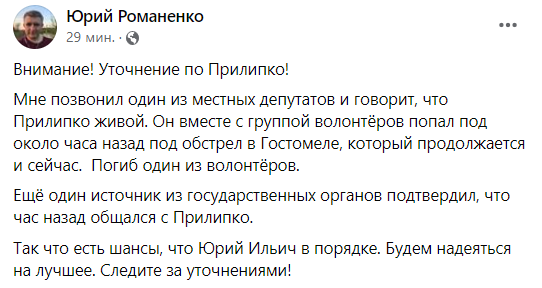 Позже Роианенко обновил информацию, заявив, что Юрий Прилипко жив. Он вместе с группой волонтеров попал под обстрел в Гостомеле. Погиб один из волонтеров.
