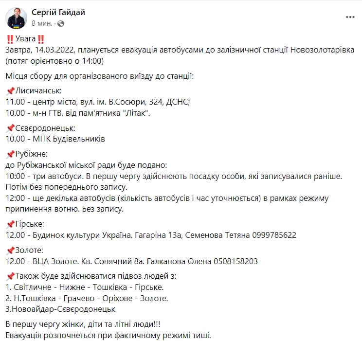 21.40 Завтра, 14 марта, в Луганской области планируется эвакуация. Глава ВГА Сергей Гайдай назвал время и места посадки в автобусы к железнодорожной станции Новозолотаровка (поезд ориентировочно в 14:00):