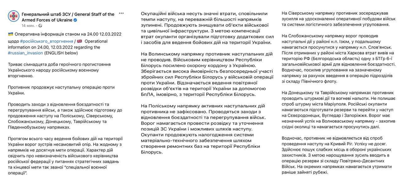 00.57 Генштаб ВСУ опубликовал сводку из зоны боевых действий в Украине по итогам 18-го дня противостояния с российскими оккупантами.