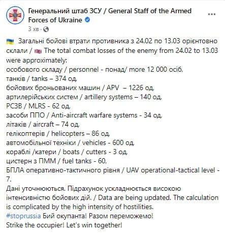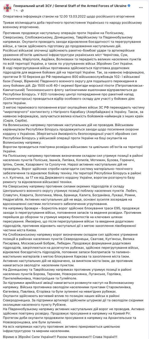 Оккупанты продолжают уничтожение стационарных объектов военной и гражданской инфраструктуры на территории Украины, пренебрегая нормами Международного гуманитарного права. 13 марта были нанесены ракетные удары по объектам в Умани, Ивано-Франковске, Старичах с применением самолетов стратегической авиации. Также продолжаются пуски ракет "Искандер" с территории Беларуси.