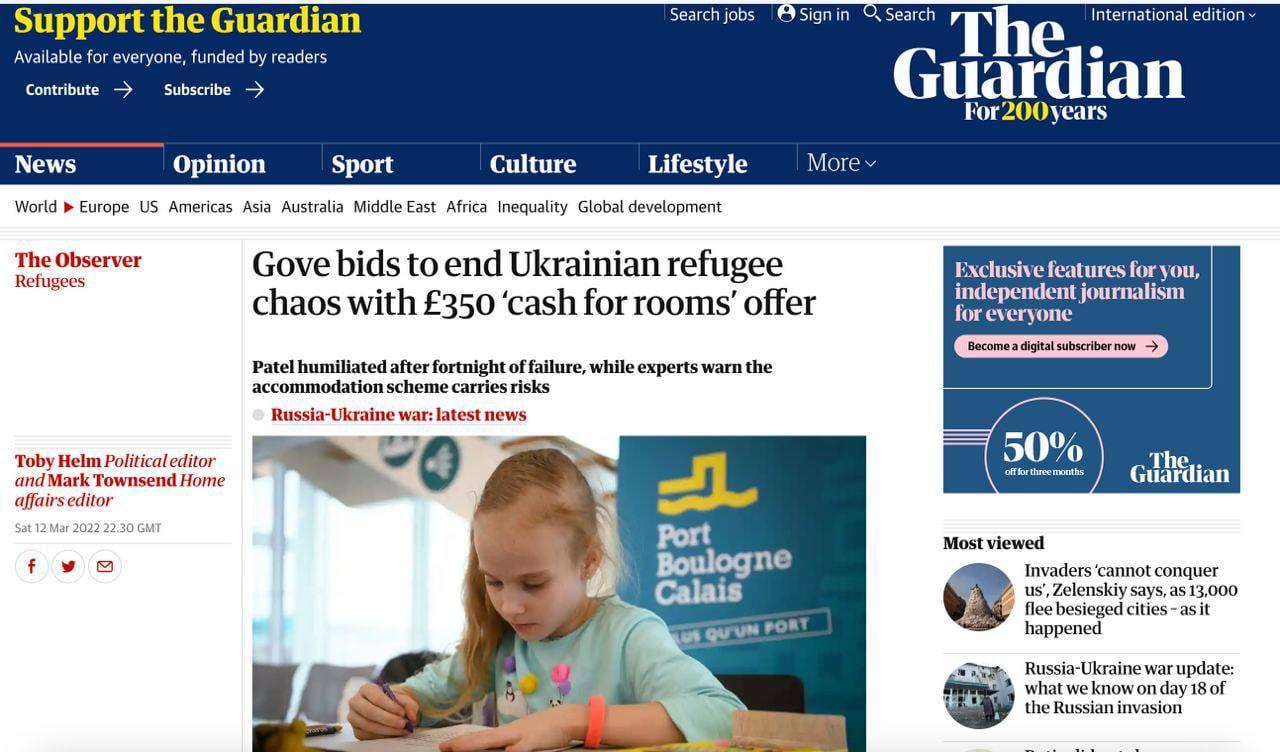 11:46 The Guardian пишет, что англичане, которые поселят у себя дома беженцев из Украины, будут получать от государства по 350 фунтов в месяц.