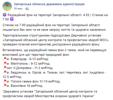 Радиационный фон остается в норме. Фото: facebook.com/zoda.gov.ua