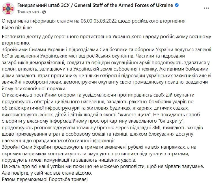 В целом никакой конкретики по театрам военных действий нет. Говорится только, что противник деморализован, ведет обстрелы гражданских и "блицкриг" провалился.