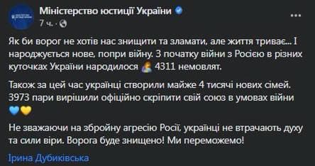 17:09 За время войны с Россией, которая началась 24 февраля, в Украине зарегистрировали почти 4 тысячи браков и родились 4,3 тысячи детей, сообщает пресс-служба Минюста.