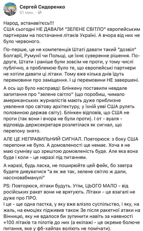 Во-первых, Блинкен не то имел в виду (см. скрин комментария журналиста Сидоренко). Во-вторых, Польша уже дала понять, что самолёты поставлять не намерена. И свои аэродромы предоставлять для украинской авиации - тоже.