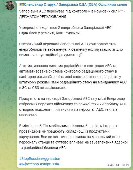 10:30 По данным Госатомрегулирования, Запорожская АЭС находится под контролем военных РФ, сообщает глава Запорожской ОГА Александр Страрух.