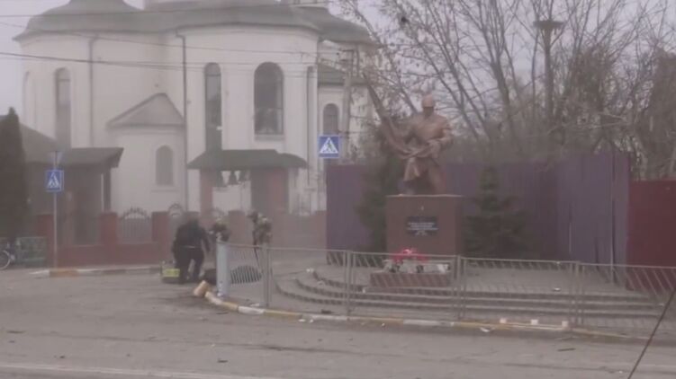 Удар по Ирпеню попал на камеры журналистов. В сети появилось видео, на котором запечатлен прогремевший взрыв. Он раздается как раз в тот момент, как по всей видимости представитель теробороны рассказывает, что вчера вывозили из города мирное население и погибших.