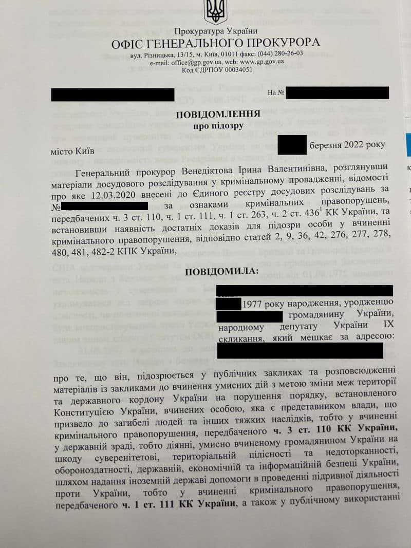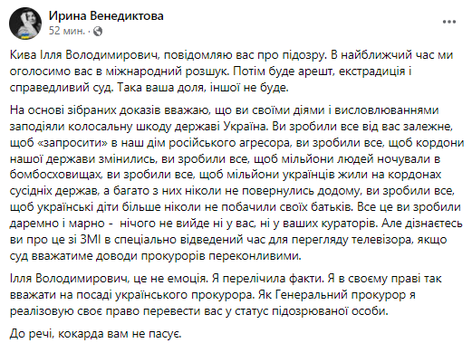 "Кива Илья Владимирович, сообщаю вам о подозрении. В ближайшее время мы объявим вас в международный розыск", - написала Венедиктова.